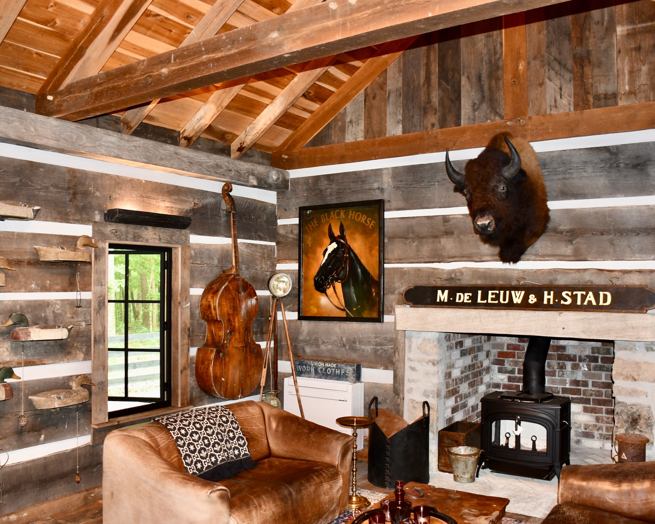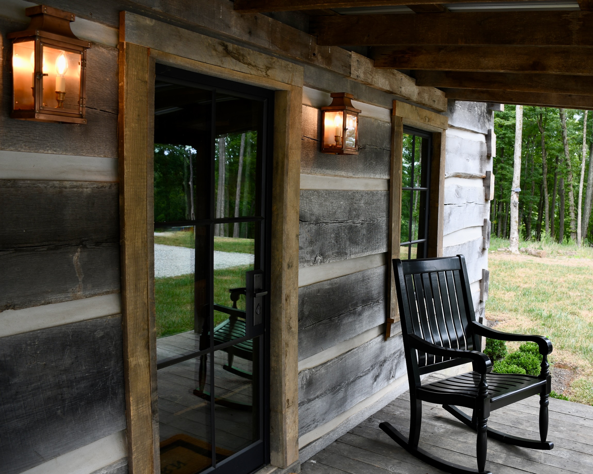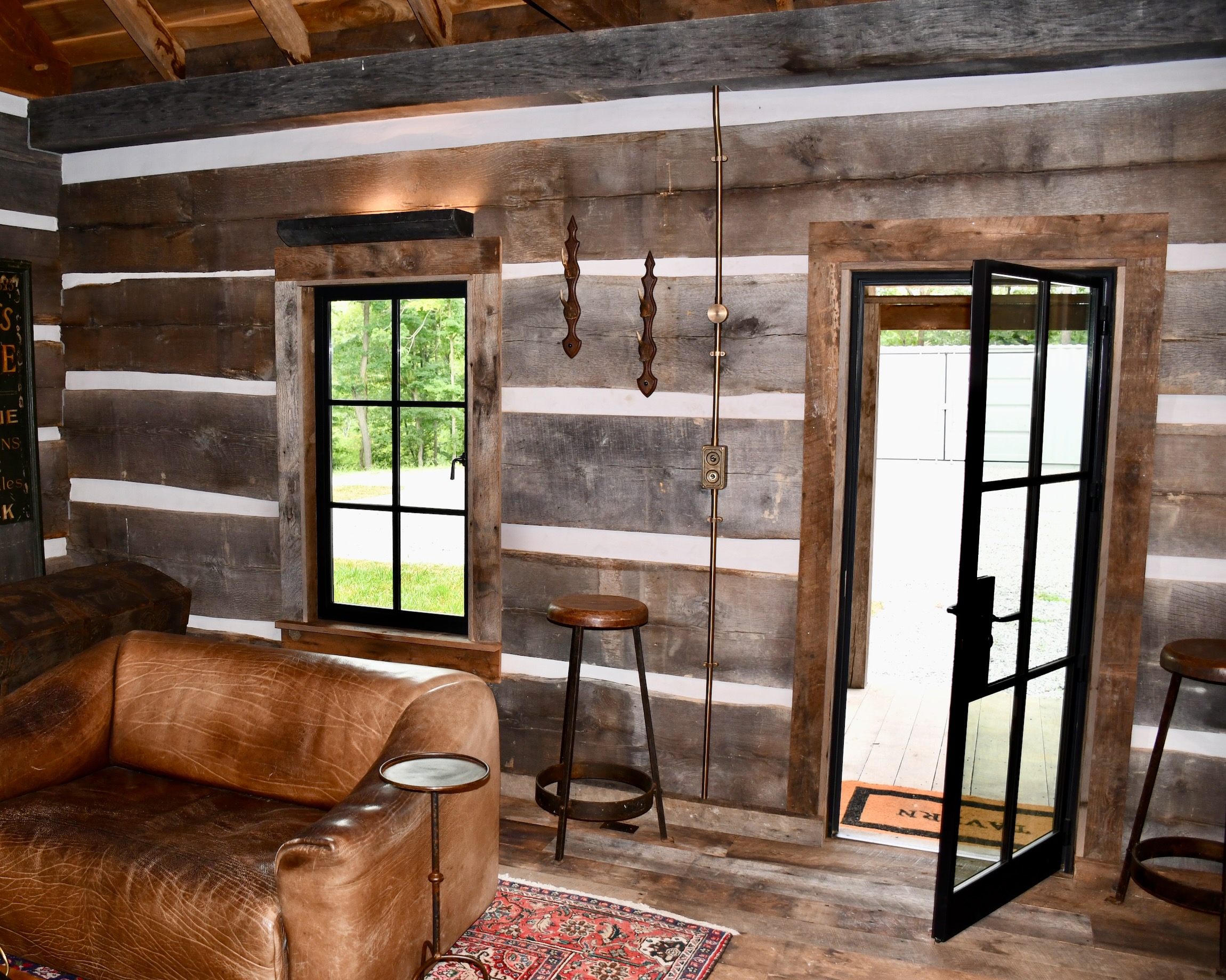 Cabin in the Woods A 19th century cabin that was taken down and rebuilt on a private ranch. The homeowner wanted to maximize light with steel doors and windows while retaining the original feel of the building.